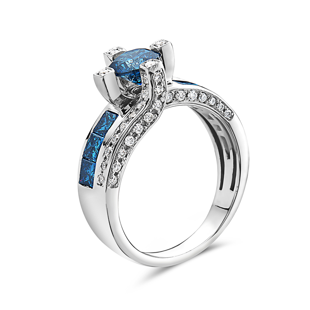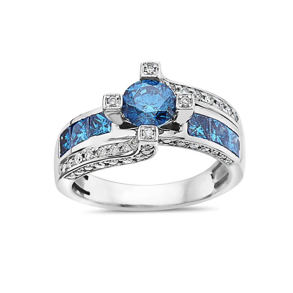 The TRUEBLUE DIAMONDS, RING is a magnificent symbol of your commitment. The central blue diamond, a rare gem, is framed by a circle of brilliant white diamonds. This halo design creates a stunning visual effect, symbolizing the protective and encircling nature of your love.